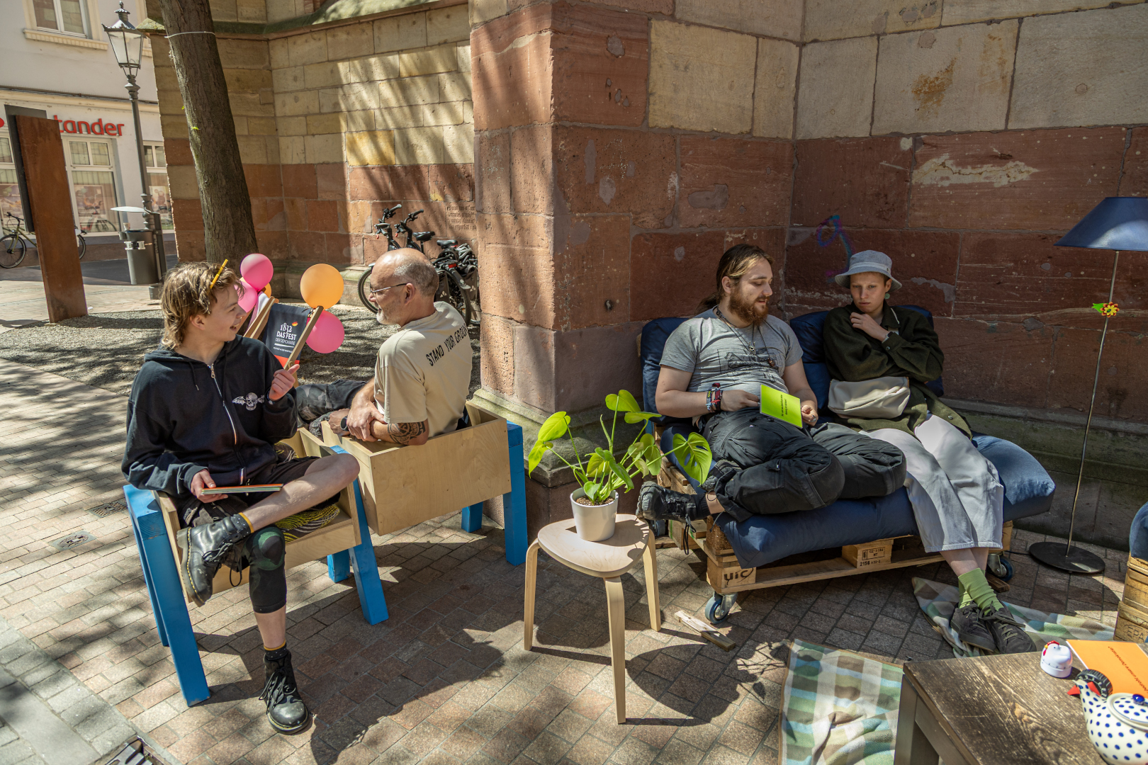 Das zweite Mal war auf dem Hambacher Schloss, während des Demokratiefestivals, in leicht abgewandelter Form. Bei der Eröffnung des Festivals haben Geladene, Politiker und Prominente der Metropolregion, sowie Angereiste aus der ganzen Welt auf unserem Sofa ihre Gedanken geteilt: So waren einmal kanadische Gäste oder auch unsere Ministerpräsidentin bei uns zu „Besuch“. Am anderen Tag, als das Schloss überlaufen von Besuchern war, haben wir dann Kommunalpolitiker verschiedener Parteien eingeladen, auf den Bänken der Demokratie, welche für das Festival bereitgestellt wurden, Platz zu nehmen und den Besuchern ihr Ohr zu leihen.